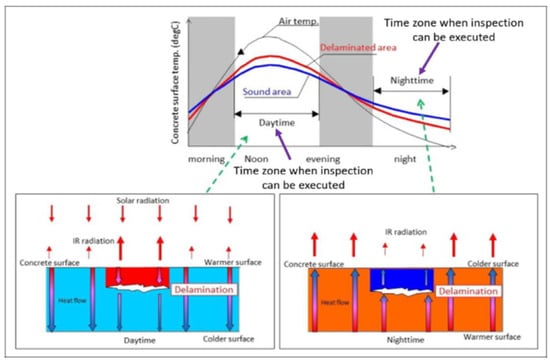 As shown in Figure 3, Matsumoto et al. [] presented the time zone when the inspection can be executed. Watase et al. [] investigated the favorable time windows for IRT for concrete delamination evaluation by using plates with different thicknesses and delamination with different depths. The different thicknesses of the plate and the depth of delamination could influence the time window. Hiasa et al. [,] explored the time window for a good inspection of IRT by using experimental and numerical methods and found that optimal conditions for IRT implementation on concrete bridge decks were during nighttime under clear sky conditions. They also investigated the effect and correlation of delamination size and shape for using IRT through finite element modeling (FEM) and found that the delamination depth information could be estimated by incorporating IRT with FEM. In addition, discussed the considerations and issues in the application of IRT for concrete scanning at normal driving speeds, such as thermal contrast, time window, camera specification, distance, and utilization speed, and they gave detailed recommendations on how to address the mentioned issues. They also implemented a high-definition (HD) camera along with the IRT cameras to scan concrete to get visual images.