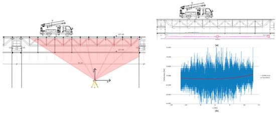 The increasing demand for the digitalization of extensive terrestrial infrastructures such as roads and railway networks within a reasonable timeframe promoted the development of more efficient data collection systems []. Thus, mobile laser scanning systems became a popular technology for the inspection and monitoring of large transport infrastructure, where bridges are among the most common critical assets linked to these infrastructure networks. Differently from static systems, mobile laser scanning systems employ two observation modes: (i) formerly, the stop-and-go mode, which is a hybrid solution between static instruments mounted in mobile platforms; and (ii) the on-the-fly mode, where the imaging sensors for distance measurement using LiDAR are the same, but the laser beam is only deflected within one plane. This results in a point cloud created according to a cylindrical coordinate system, where the third dimension is obtained with the motion of the vehicle by accessing the trajectory data.