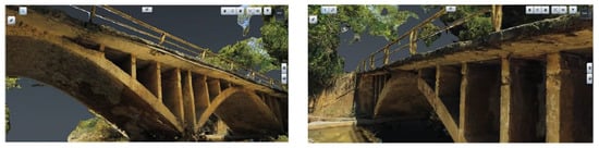 Terrestrial photogrammetry has also been considered for the creation of structural models of existing bridges, especially relevant to the case of masonry arch bridges where actual geometry is important and related to their structural stability. For example, photogrammetry was found to be very useful for the creation of an accurate 3D model of an arch ring of a bridge, modeling every one of its voussoirs that was lately integrated for both FEM and rigid block analyses []. A 3D model of the same bridge was lately used for different structural analyses considering their actual damage condition [] or for further analysis considering different approaches: for example, elastic analyses taking into account the possible variations in the arch geometry []; or models that incorporate damage, elastoplasticity and contacts [].