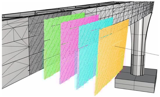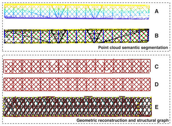 Point clouds are unorganized sets of points without any information on the object to which a point belongs, so preliminary operations are needed not only to add semantics to the points but also to cluster them into subsets to relate them to real structural components. In addition, topology information is also essential when structural damages are to be analyzed because the spatial relationship between structural elements is a key aspect to consider when analyzing the structural performance of the bridge as a whole. Thus, one common task in automated SHM from laser scanning data typically involves one preliminary operation consisting of the semantic and instance segmentation of the point clouds. In this sense, relevant work has been presented for the automated inspection of masonry arch bridges. A heuristic method was presented by Riveiro et al. [], where the global point cloud of bridges was fully automatically segmented into instances corresponding to spandrel walls, arches, piers, abutments, parapets and pathways. Recently, the use of deep neural networks (BridgeNet) was proved to efficiently provide semantic segmentation for this same bridge typology []. Semantic segmentation of reinforced concrete bridge elements was also reported in the literature [].
