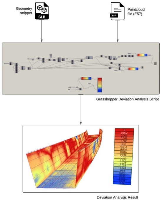 The first works about laser scanning in bridge engineering presented processing flows using commercial software packages, typically linked to specific laser scanner manufacturers. Additionally, manual processing was the predominant trend for the data analysis. In these works, the workflow was quite straightforward, and authors typically conducted some common operations comprising scan registration, point cloud cleansing and homogenization, meshing and even coloring using complementary photogrammetric surveys, among others [,]. One of the pioneer applications of terrestrial laser scanning for bridges was deformation monitoring. Thus, one of the most remarkable works was published by Gordon et al. [], where the successful deformation monitoring of bridge structural members was not the only contribution. In addition, they demonstrated that TLS systems can provide up to 12 times better accuracy in the measurement of deflections than the nominal accuracy of the instrument for single-point measurements. Later, Zogg and Ingensand [] incorporated terrestrial laser scanning into the deflection monitoring of a viaduct, alongside traditional surveying methods, to validate its effectiveness for such purposes. Likewise, Berényi et al. [] conducted research to validate the application of TLS in load test measurements on bridges. Their paper delves into various aspects, including the approach to measuring complex structures with limited accessibility. Many works started proposing combined surveys, including both traditional leveling and terrestrial laser scanning during load tests (e.g., []), because even though TLS cannot replace high-accurate geodetic measurements, the 3D surface measurement results are very valuable in monitoring the deformations in a continuous domain []. Alamdari et al. [] compared laser scanning data to other accurate geodetic methods in load tests of a cable-stayed bridge. The data was very useful in validating the deformations predicted by the FEM model of the bridge. Recently, Truong-Hong et al. [] presented an interesting analysis of the main sources of errors in the deformation monitoring of structural members: (i) error produced due to registration of multiple scanning stations; (ii) error committed during the segmentation of point clouds of structure surfaces; (iii) definition of the surface of reference; and (iv) influence of noisy points (outlier and/or mixed pixels).