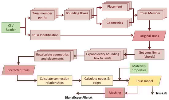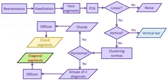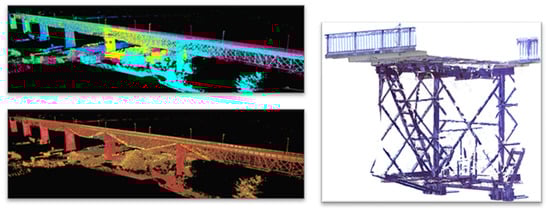 Steel truss-type bridges were also subjected to fully automated geometric reconstruction using laser scanning data. The complementary work recently presented by Lamas et al. [] and Justo et al. [] proposed a pipeline for laser scanning data processing consisting of a heuristic semantic and instance segmentation of truss bars for further geometric modeling and exportation using IFC-compliant models. These scan-to-BIM approaches will be presented further in the case studies presented in Section 3 of this paper.