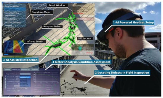 - Karaaslan, E.; Bagci, U.; Catbas, F.N. Artificial Intelligence Assisted Infrastructure Assessment Using Mixed Reality Systems. Transp. Res. Record 2019, 2673, 413–424. [Google Scholar] [CrossRef]