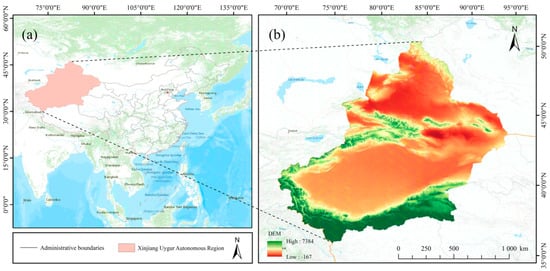 Figure 1. Maps of the study area: (a) Geographic location of Xinjiang in China; (b) topography of Xinjiang.
