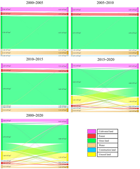 The Sankey diagram was plotted to quantify the flow and diversity of land use changes and depict the overall distribution of land use changes in 2000–2020 (Figure 4). The period witnessed many conversions of grassland and unused land, where grassland was mainly converted to unused land, cropland, and forest, and unused land was mainly converted to grassland and cultivated land. The largest conversions involved cultivated land to grassland, forest to grassland, and water to unused land. Adopting five-year intervals, land use transfers occurred mainly in 2015–2020.