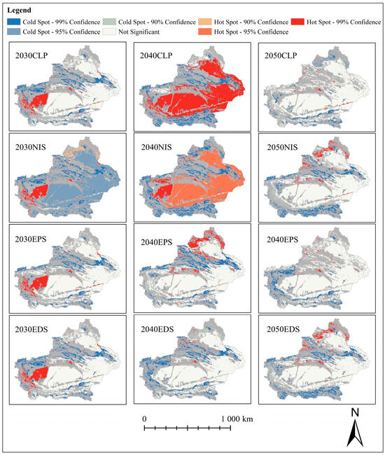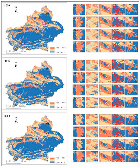 We refer to reference [51] for different social and economic development goals and government development plans. The four scenarios described above are set up as follows: (1) NIS assumes that land use changes in 2020−2050 are not affected by major policies and plans, and that the magnitude and trend of future land use changes continue the evolution and development pattern of the 2000−2020 period. The land use raster number for the next 30 years under the natural development scenario is obtained by running the CA-Markov transfer probability matrix to obtain the number of land use grids under the natural development scenario. (2) CLP: Based on the natural development scenario, cultivated land is protected according to the “Outline of the National Overall Land Use Plan (2006−2020) (https://www.gov.cn/guoqing/2008-10/24/content_2875234.htm, accessed on 24 October 2008)” and “Overall Land Use Plan of the Xinjiang Uygur Autonomous Region (2006−2020) (https://zrzyt.xinjiang.gov.cn/xjgtzy/ghjh/201806/3036bbc523c0456cb43e41cd27e8bd06.shtml, accessed on 23 June 2018)” to ensure that cultivated land area occupies a larger proportion in each land use category, and cultivated land will increase by 1.2 times compared to the natural development scenario. (3) EPS prioritizes ecological benefits, ensuring the quantitative advantages of the ecological land types of woodland, grassland, and watershed, and restricting their large-scale and high-rate transformation to other land types. Compared to the natural development scenario, the woodland, grassland, and watershed areas have increased by 1.2, 1.2, and 1.6 times, respectively. (4) EDS: Based on the natural development scenario, economic development is reasonably guided and controlled according to relevant planning policies such as Xinjiang Uygur Autonomous Region New Urbanization Plan (2014−2020) (https://xjdrc.xinjiang.gov.cn/xjfgw/c108364/202108/1f41aafc062c4c10af324d0ba42f4c44.shtml, accessed on 30 August 2021) and Xinjiang Uygur Autonomous Region Town System Plan (2021−2035) (https://www.gov.cn/gongbao/2024/issue_11386/202406/content_6955759.html, accessed on 17 April 2024). Compared to the natural development scenario, the urban construction land area will grow moderately. However, disorderly expansion will be strictly controlled to avoid excessive conversion to other land types, such as arable and forest land. Compared to the natural development scenario, cultivated land, forest land, grassland, and water areas have increased by 1.2, 1.2, 1.6, and 1.2 times, respectively.