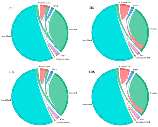 Under the NIS, cultivated land and unused land will decrease by 2050 compared to 2020. Cultivated land, grassland, water, and unused land are projected to decrease by 69 km2, 2102.67 km2, 27,129.24 km2, and 606.42 km2, respectively. Forested area and construction land will expand by 1727.01 km2 and 48,527.01 km2, respectively (Figure 6). Concerning the land transfer direction (Figure 7), The bi-directional conversion between cultivated land and grassland will persist, with the transformation of cultivated land into unused land continuing to be predominant. The increase in the built-up land will mainly originate from arable land, grassland, and unused land, in addition to the fact that unused land will be mostly converted into arable land and grassland.