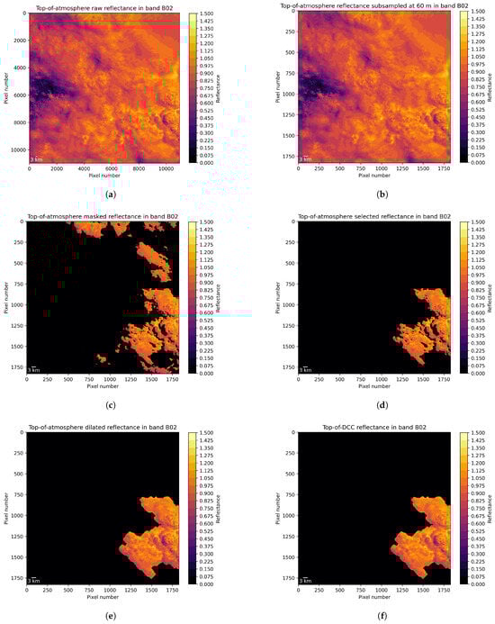 DCC detection steps for band B02 at 492 nm in product S2A_MSIL1C_20240505T144731_ N0510_R139_T20NKG_20240505T181400. (a) Raw Sentinel-2A TOA reflectance at 10 m resolution. (b) Subsampled TOA reflectance at 60 m resolution. (c) Subsampled TOA reflectance with detection thresholds applied using bands B8A and B10. (d) TOA reflectance with small DCC clusters removed. (e) TOA reflectance with morphological dilation applied to the DCC mask. (f) Top-Of-DCC reflectance after atmospheric correction has been applied.