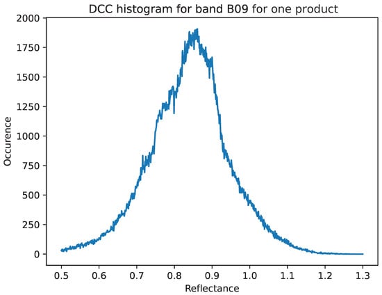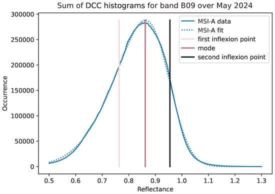 From each product containing DCC pixels and for each band, histograms of the pixels are computed. For VNIR bands, reflectances are binned between 0.5 and 1.3 with a bin size of , and for SWIR bands the size of the bin is the same but reflectances are binned between 0 and 0.8 as reflectances tend to be smaller (see below). An example of such a histogram is presented in Figure 2, computed with the selection mask presented in Figure 1. Different histograms can be summed, and we use the methodology presented in [4] to evaluate a reflectance indicator. First of all, a skewed Gaussian distribution is fitted to the sum of histograms in order to remove statistical noise from the data. Then, the second inflexion point—which is the second extremum of the gradient of the curve fitting the histogram—is computed analytically from the parameters of the fitted skewed Gaussian distribution. This second inflexion point is referred to as the reflectance indicator. We use the second inflexion point instead of the mode, because it has been shown to be me more stable. The fit to the sum of histograms, the mode, the first and second inflexion points of the distribution are presented in Figure 3 using the sum of all MSI-A DCC histograms available in May 2024 for band 9.