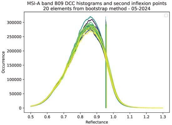 In order to evaluate the uncertainty associated with the statistical sampling, we use the bootstrap method [15]. It consists in constructing N sums of histograms by randomly sampling with replacement all available histograms over a month, for each band. From each of the N sums of histograms, we evaluate a reflectance indicator by using the second inflexion point, as presented above. We obtain a set of N reflectance indicators. Histograms computed with this method, for , along with the associated reflectance indicators, are presented in Figure 4 for MSI-A in May 2024 for band 9. After having removed outliers from this set, we use it to compute a mean and a standard deviation. These two values are used as (i) the reflectance indicator of the sensor for the specified month and the specified band and (ii) the uncertainty associated to the statistical sampling of this reflectance indicator. The algorithm is implemented with a value of 100 for N. The results and associated uncertainties presented in Section 3 were computed using this method.
