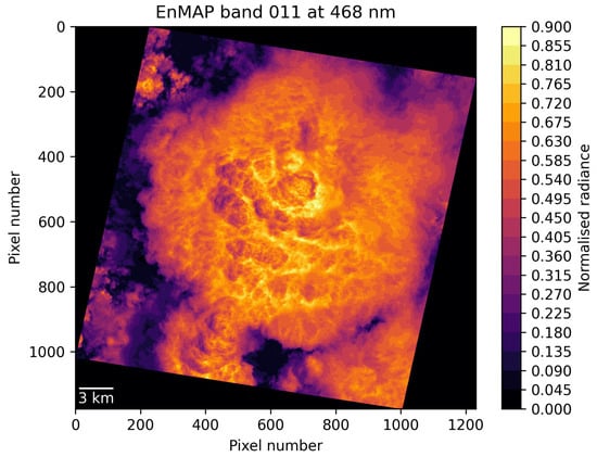 Figure 5. Example of DCC observed by EnMAP at 468 nm and used in this study. Product identifier is ENMAP-HSI-L1CDT0000060165_12-2024-02-01T08:30:08.938. - For each EnMAP product containing a DCC and for each Sentinel-2 or Landsat 8 or 9 band to be simulated, we simulate what each sensor would have seen if it had observed the scene. This is performed by computing a weighted average of EnMAP bands using the SRF of the band to be simulated, for all the pixels in the image. This weighted average is performed with a linear interpolation of the SRF at the spectral resolution of EnMAP bands. See Figure 6 for an example of SRF interpolation. Thus, 15 simulated products are obtained for Sentinel-2A, Sentinel-2B, Landsat 8 and Landsat 9.