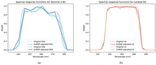 Figure 6. Spectral response functions of Sentinel-2 MSI-A, MSI-B, Landsat 8 OLI and Lansat 9 OLI-2 band 3 at 560 nm at their highest resolution available and sampled at the resolution of EnMAP bands. (a) Sentinel-2 MSI-A and MSI-B. (b) Landsat 8 OLI and Lansat 9 OLI-2. - DCC masks are extracted from these products, as presented in Section 2.1, and reflectance indicators are derived, as presented in Section 2.3. The only difference between a simulated Sentinel-2A product and a simulated Sentinel-2B product being the SRF used to simulate each band, the value obtained when computing the relative difference between the two sensors is the impact of spectral differences.