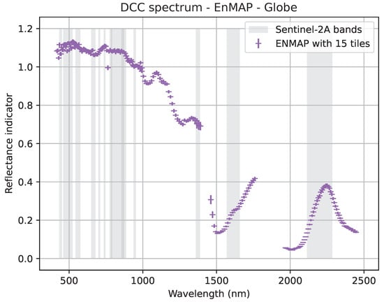 After step 2 of the list above, by using only the pixels flagged as DCCs in the 15 EnMAP products containing DCCs, it is possible to compute a mean DCC spectrum. It is presented in Figure 7. It can be seen that, in the VNIR spectral range, a DCC is indeed bright and white. The spectrum obtained is similar in shape to that published in [18] (Figure 9) between 500 nm and 1600 nm, which is the common spectral region displayed in the two graphs, albeit slightly brighter when measured with EnMAP. In the SWIR spectral range, the DCC spectrum is not flat nor bright. This highlights the need for SBAFs when looking at bands not located in the flat spectral range of DCCs.