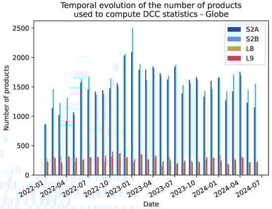 The methodology presented in Section 2 is operational since January 2022 for Sentinel-2 units A and B, Landsat 8 and 9. Multiple times a day, most recent products matching filtering criteria presented in Section 2.1 are downloaded and DCC pixels are extracted. The location of Sentinel-2 units A, B, Landsat 8 and 9 products containing DCC pixels during a typical month (here August 2023) is presented in Figure 8. The number of products containing DCC pixels for each month and each sensor can be seen in Figure 9, from January 2022 to June 2024. The number of Landsat products is much lower than the number of Sentinel-2 products: indeed, Sentinel-2 has a wider swath and its products have a smaller footprint.