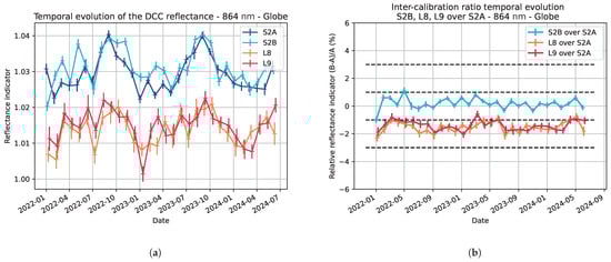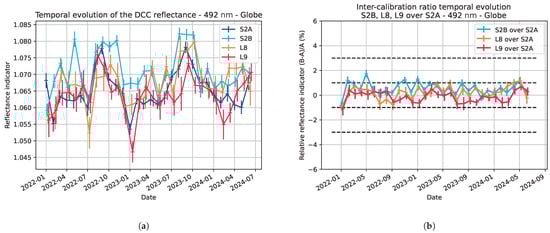 Temporal evolution of the reflectance indicators for Sentinel-2 units A and B, Landsat 8 and Landsat 9, between January 2022 and June 2024, for bands centered at 492 nm. (a) represents the temporal evolution of the absolute reflectance indicators while (b) represents the temporal evolution of the relative differences of a reflectance indicator of a sensor with that of Sentinel-2A. SBAFs are applied in (a,b); in (a) SBAFs are applied taking Sentinel-2A as reference. Error bars are a measure of the uncertainty in terms of the standard deviation of the mean. Dashed lines represent one and three percent relative difference with the reference.
