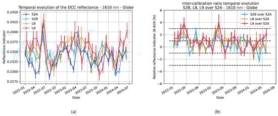 Each month, a reflectance indicator and the associated standard deviation used as uncertainty are evaluated, for Sentinel-2 units A and B, Landsat 8 and Landsat 9, using all products processed during the month. Figure 10, Figure 11 and Figure 12 present the temporal evolution of the reflectance indicator for these sensors, from January 2022 to June 2024, for bands at 492 nm, 864 nm and 1610 nm. The results for other wavelengths are in Appendix A, Figure A1, Figure A2, Figure A3, Figure A4, Figure A5, Figure A6, Figure A7, Figure A8, Figure A9 and Figure A10. In Figure 10, Figure 11 and Figure 12 (and Figure A1, Figure A2, Figure A3, Figure A4, Figure A5, Figure A6, Figure A7, Figure A8, Figure A9 and Figure A10), the graph on the left represents the temporal evolution of the absolute reflectance indicators for each sensor, while the graph on the right represents the temporal evolution of the relative differences of the reflectance indicator of a sensor over the reflectance indicator of Sentinel-2A. Each month, the relative difference between two sensors B and A and the associated uncertainty are computed using Equations (4) and (5) [19].