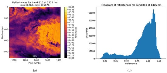 Sentinel-2A image and associated histogram of a DCC over Barbados in band 10 on the 01/07/2024 (product S2A_MSIL1C_20240701T143751_N0510_R096_T20PRV_20240701T175847). Saturation over the DCC can be seen on the right-hand part of (a). (a) Sentinel-2A image. (b) Histogram of reflectances.