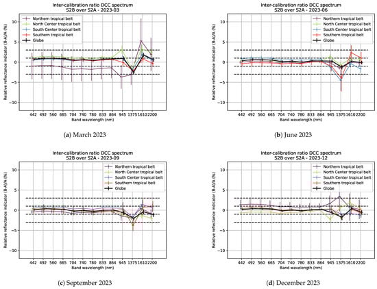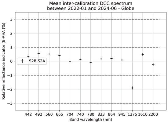Figure 14 represents the mean relative differences of Sentinel-2B over Sentinel-2A, between January 2022 and June 2024. The values of the relative differences are given in Table 3.