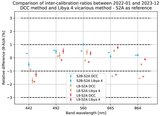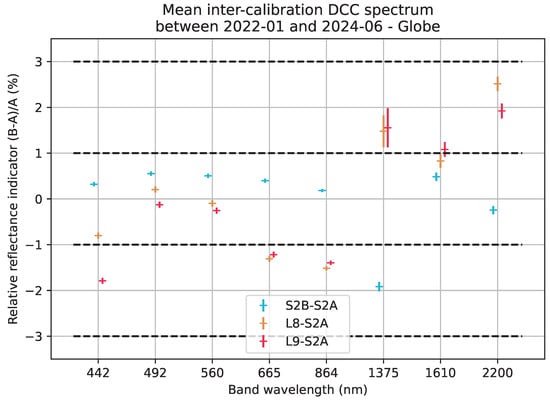 Figure 16 represents the mean relative differences of Sentinel-2B, Landsat 8 and Landsat 9 using Sentinel-2A as the reference sensor, for eight common bands, between January 2022 and June 2024. The values of the relative differences are given in Table 5.