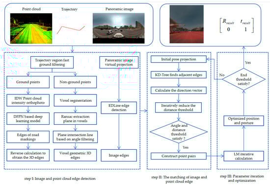 In order to obtain the registration relationship between the panoramic image and the point cloud, an automatic registration method of the panoramic image and point cloud based on line feature is proposed. Firstly, the point cloud is projected to generate a seamless intensity orthoimage to make full use of the intensity information in the point cloud. The boundary of the area with obvious intensity changes, such as road markings, is extracted by image semantic segmentation. At the same time, the point cloud voxel is used to fit the plane intersection method to extract the obvious features of buildings or other geometric boundaries. According to the characteristics of panoramic image projection, the virtual projection segmentation is carried out, and the straight line edge extraction is carried out based on the segmented image. Then, according to the initial external parameters, the panoramic projection model is used to project the three-dimensional edge lines extracted from the point cloud onto the image, and the edge direction vectors in the point cloud and the panoramic image are combined to filter the wrong registration. We then minimize the pixel difference and the direction difference as the loss function, use the Levenberg–Marquardt (LM) optimization method to perform iterative calculations, continuously reduce the distance threshold of the pixel registration to perform again, and finally obtain accurate external parameters. The overall technical process is shown in Figure 1.