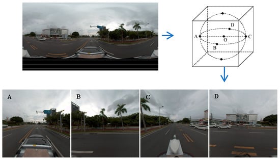 A panoramic image is a spherical image, which is usually expressed by cylindrical projection. It is difficult to extract line features directly from panoramic images in areas with large deformation. As shown in Figure 2, the ground lines are originally distributed in a straight line, because the projection becomes an arc. In order to solve this problem, this paper projects the panoramic image onto the external cube of the panoramic ball by virtual projection segmentation of the panoramic image, as shown in Figure 2. The projection formula is as follows: