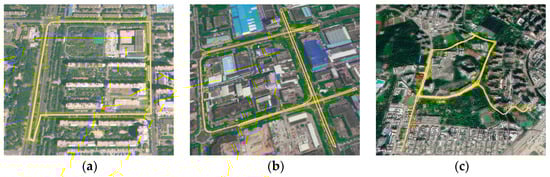 In order to comprehensively verify the applicability of the proposed algorithm in different application scenarios, this paper selected three types of urban data sets with typical characteristics. Among them, the dataset I corresponds to clear road markings, a wide scene, fewer surrounding buildings, and a long distance from the road. The dataset II corresponds to clear road markings, but there are more trees and moving targets near the road. Dataset III has more buildings, but fewer road markings. The visualization effects of different methods on different data sets are in Figure 10.