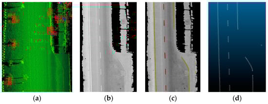 For the extraction of road markings, due to the sparsity of the point cloud, it is relatively difficult to extract the boundary of the road markings directly on the point cloud. The method [22] is processed by setting an intensity threshold. However, the intensity range obtained by different lasers is different, and the threshold is difficult to select. In order to overcome this problem, this paper uses the inverse distance weighting (IDW) method to convert the sparse point cloud into a high-resolution intensity orthoimage, and uses the semantic segmentation algorithm to obtain the edge line of the road markings.