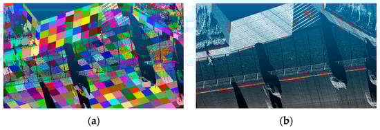 According to the principle of the algorithm, and after many experiments, the main parameters are recommended as follows: In the point cloud intensity orthoimage processing, the height threshold after ground fitting is set to 0.2 m, and the GSD of the intensity image is set to 2 cm. When the voxel fitting plane method is used to calculate the feature edge line of the point cloud, the voxel size is set to 1 m, the minimum number of points satisfying the plane is set to 30, and the angle threshold between the surface and the surface is set to 65–135 degrees. The distance threshold of the initial registration of the homonymous point is 30 pixels, the direction angle threshold of the homonymous point is 30 degrees, and the maximum number of iterations is 100.