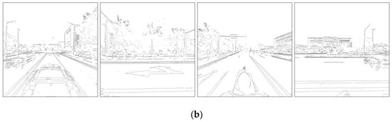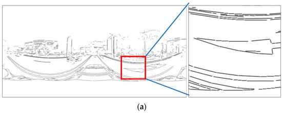 Generally speaking, the sky is mostly above the panorama, and the acquisition platform is mostly below the panorama. Therefore, the panorama is virtually projected into front, back, left, and right images, respectively. In order to ensure the integrity of the edge, each direction of the image is extended outward to a certain pixel, so that the two adjacent images have enough overlap. The projected images are processed using the line detection algorithm [26] to obtain the edge features in the panoramic image.