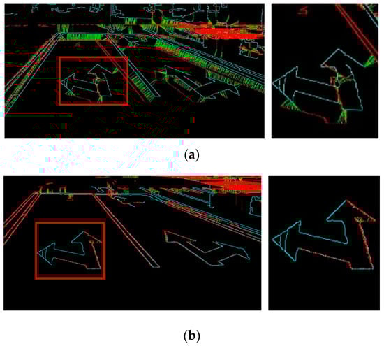 Panoramic image segmentation and the boundary extracted by ED lines in the image are shown in Figure 7. The boundary effect directly extracted from the panoramic image is shown in Figure 7a. The arrows in the panoramic image are also extracted, but they are obtained by fitting multiple straight lines. The straight line fitting will lose the accuracy of the boundary extraction, and the direction is not accurate during the registration process. Therefore, this paper uses projection to the virtual plane and then extracts the boundary.