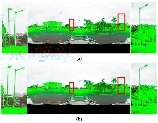 In order to evaluate the results of registration more intuitively, the point cloud is mapped to the panoramic image. Figure 9a is the effect before the algorithm processing, and Figure 9b is the effect after the algorithm processing. In order to view more clearly, the local area is enlarged and displayed. It can be seen from Figure 9a that there is a significant deviation between the image and the point cloud. The light pole and other features in Figure 9b are well registered. Compared with the initial position, the results after the algorithm processing have been greatly improved. From the details of registration, we can see that our method achieves excellent performance, which characterizes the superiority of the proposed method in image and point cloud registration.