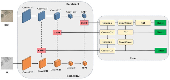We pass the outputs from the three corresponding Conv+C2f modules of the dual-backbone network to the CSIFF module to achieve multi-modal feature fusion. The fused results are then transmitted to the head network, successfully embedding the CSIFF module within the backbone. In the head network, the fused features undergo further interaction and fusion with deep features through upsampling and concatenation operations, ultimately outputting detection results at three different scales. The detection head comprises separate classification and regression heads, responsible for target classification and bounding box regression, respectively.