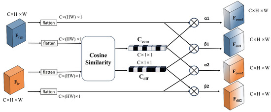 Cosine similarity, as an efficient and stable similarity measurement method, boasts fast calculation speed and high resilience to changes in image brightness and contrast [37]. It has been utilized to calculate the similarity between texts or images [38]. Liu et al. [39] applied weighted cosine similarity for image retrieval. Researchers Li et al. [40,41,42] successfully applied the cosine similarity metric to image classification tasks. Yuan et al. [43] combined cosine similarity calculation with feature redundancy analysis, removing redundant features through cosine transformation. Islam et al. [44] used cosine similarity to filter similar images in medical imaging. Ahmad et al. [45] replaced dot product operation in convolutional operations with sharpened cosine similarity calculations, measuring similarities in direction, providing a new perspective for feature extraction. Wang et al. [46] proposed a target detection network model named YOLO-CS, which ingeniously adopted cosine similarity to replace the traditional dot product operation for measuring the similarity between cross-scale features, thereby facilitating efficient fusion of multi-scale features. Furthermore, cosine similarity was also applied in the construction of the loss function, significantly enhancing the model’s ability to distinguish between backgrounds and targets. Practical applications have demonstrated that the YOLO-CS model exhibits higher accuracy in UAV detection tasks, effectively resolving the original issues.These studies collectively demonstrate the significant application potential of cosine similarity in object detection and image processing. Existing research methods primarily apply cosine similarity in fields such as image classification, retrieval, and similar image filtering. They also propose a new feature extraction approach by using cosine similarity to replace the dot product in convolutional calculations. However, when calculating the similarity between images using cosine similarity, they typically flatten all pixels of the entire image into a one-dimensional vector, or compress image channels and flatten the pixels of cropped or processed sections into one-dimensional vectors for computation. Research that treats an image’s feature channels as a unit and flattens the pixels of a single feature channel into a vector to calculate the similarity between corresponding feature channels of different modalities is relatively scarce.