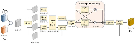 Subsequently, we utilize the obtained and matrices to perform element-wise multiplication with each channel of the original input features and , respectively, to achieve attention weighting. In this process, adaptive parameters and are introduced as regulatory factors to dynamically adjust the importance of different features, thereby optimizing the final feature representation, as shown in Equations (3)–(6). The overall process of this module is illustrated in Figure 4.