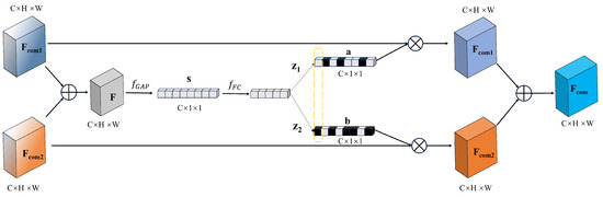 The module receives visible similar features and infrared similar features after feature partitioning, and adaptively selects important features from the two channels while removing redundant features, as shown in Figure 6. Inspired by select kernel [47], this module simplifies its structure by retaining only the Fuse and Select parts. Initially, the two modal features are combined through element-wise summation to obtain F. Then, global average pooling is applied to derive the global information s. Subsequently, the attention vectors a and b for the two modalities are derived using a shared fully connected layer , followed by individual operations for each modality. The attention vectors are multiplied with the corresponding inputs of the module and then added element-wise to obtain the final similar fused feature .