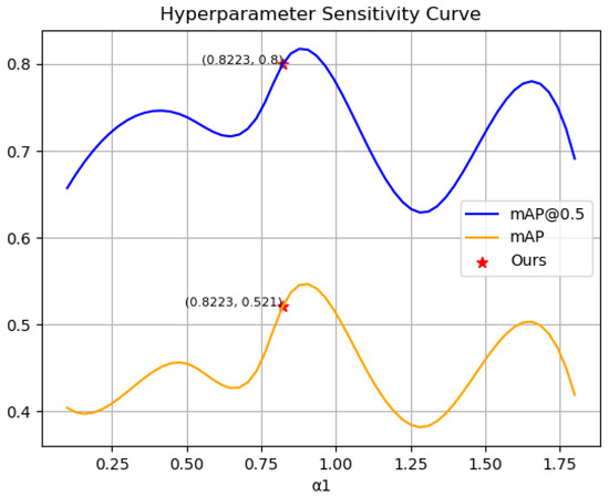 To investigate the specific impact of the four adaptive parameters within the FS module on model performance during training, we designed a parameter sensitivity experiment. In this experiment, we held constant the values of , and , while manually adjusting the value of , observing and recording the changes in the model’s mAP@0.5 and mAP values as varied. This approach allowed us to intuitively assess the sensitivity of to the overall effectiveness of the model. Based on the data obtained from the experiment, we fitted a smooth curve to illustrate the trend of model performance as a function of , as shown in Figure 7. The shape of this curve reflects the sensitivity of the model’s performance to changes in . Our findings revealed that when the value of falls within a specific range, the model performance undergoes notable fluctuations, further affirming the pivotal role of the parameter in shaping model performance. Notably, The red star in the figure represents the value that the adaptive parameter actually adjusted to during the normal training process of our model. It is noteworthy that the parameters selected by the adaptive algorithm are situated close to the peak of model accuracy corresponding to this curve. This result not only underscores the necessity and effectiveness of adaptive parameters but also offers a solid foundation and clear direction for further optimizing model performance.
