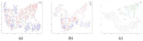 Feature visualization using t-SNE method. (a) Distribution of original input features. (b) Features after partitioning by FS Module. (c) Features processed by DFP and SFP modules.