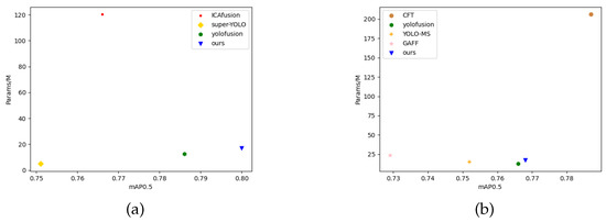 In Figure 11, We have shown the Params-mAP@0.5 scatter plots for various models on both the VEDAI and FLIR datasets, it becomes evident that within the relatively low parameter count range, our method achieves superior performance, highlighting its tremendous potential in resource-constrained scenarios.