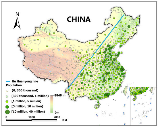 According to the 2020 Statistical Bulletin on the Development of Civil Affairs from the Ministry of Civil Affairs of China, as of the end of 2020 [48], there were four municipalities directly under the central government and 333 prefectural-level administrative units (including 293 prefectural-level municipalities, 30 autonomous prefectures, 3 leagues, and 7 districts) in the country. These 337 municipalities were selected as the study area (Figure 1). As one of the most populous countries in the world, most of China’s population is clustered in the southeast region of the Hu Huanyong Line, a region that includes economically developed and densely populated areas such as the Yangtze River Delta region and the Pearl River Delta. China’s topography is characterized by a high west and a low east, with the west including areas with complex landscapes such as the Tibetan Plateau and the Western Sichuan Plateau, while the eastern region includes flatter areas such as the North China Plain and the Yangtze River Basin.