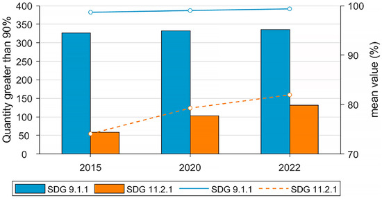 Overall, both the SDG 9.1.1 and SDG 11.2.1 indicators demonstrate an upward trend (Figure 3). The national averages for the SDG 9.1.1 indicator for the years 2015, 2020, and 2022 were 98.68%, 99.03%, and 99.36%, respectively, showing a total increase of 0.68% from 2015 to 2022. The number of municipalities where the SDG 9.1.1 indicator did not exceed 90% decreased from 10 in 2015 to 1 in 2022. The national averages for the SDG 11.2.1 indicator for the years 2015, 2020, and 2022 were 85.15%, 88.34%, and 90.00%, respectively, with a total improvement of 4.85% from 2015 to 2022. The proportion of municipalities that reached 90% for the SDG 11.2.1 indicator was 17.5% in 2015, 30.6% in 2020, and 39.1% in 2022.