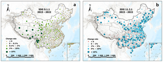 Changes in SDG 9.1.1 and SDG 11.2.1 indicators from 2015 to 2022. (a) shows changes in SDG 9.1.1 indicators and (b) shows changes in SDG 11.2.1 indicators.