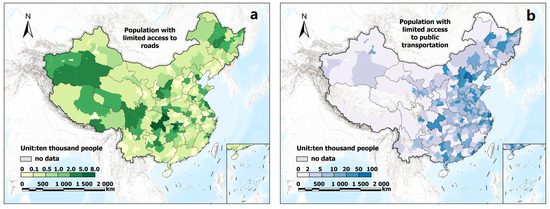 Spatial distribution of population with inconvenient access to roads and public transportation in 2022. (a) shows the distribution of the population with poor access to roads and (b) shows the distribution of the population with poor access to public transportation.