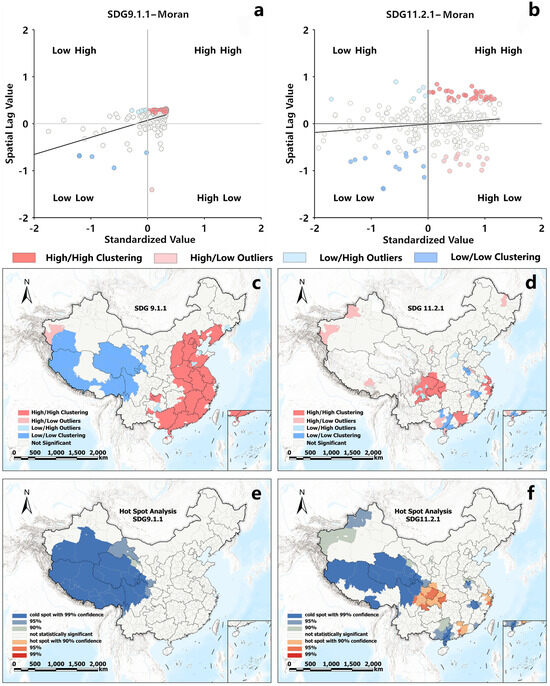 The local Moran’s Index for SDG 9.1.1 exhibited high values in the east and low values in the west, with significant positive autocorrelation in coastal provinces (Figure 7c). Western China, including Tibet, Qinghai, and parts of Sichuan and Xinjiang, was a cold spot with significantly lower indicator values (Figure 7e). The SDG 11.2.1 indicator showed high aggregation in the Sichuan–Chongqing, Yangtze River Delta, and Pearl River Delta regions, with more dispersed low aggregation in Tibet, Qinghai, Sichuan, Guangxi, Jiangxi, and northern Anhui (Figure 7d,e). The scatter plot of the local Moran’s Index showed that the SDG 9.1.1 indicator accounted for more municipalities with high–high-type aggregation, indicating that the SDG 9.1.1 indicator had a strong spatial positive correlation and significant spatial clustering characteristics at the national level. SDG 11.2.1 (Figure 7a,b), on the other hand, was more dispersed, with more municipalities clustered in low–low and high–high types than in high–low and low–high types.