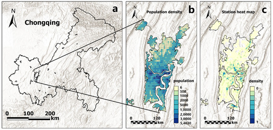 (a) shows the built-up area of Chongqing, (b) shows the population density of the built-up area and (c) shows the heat map of public transportation stations in the built-up area.