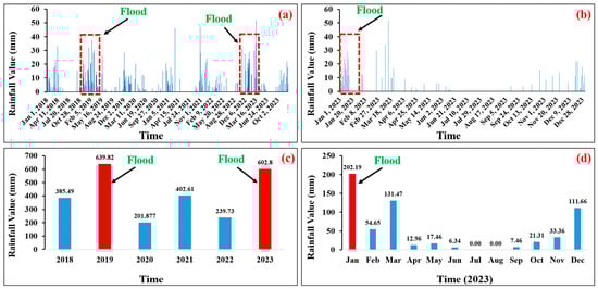 Daily, monthly, and annual precipitation variations in the study area. (a) Daily precipitation changes from 2018 to 2023, (b) Daily precipitation variations during the flood event year (2023), (c) Total annual precipitation in the study area from 2018 to 2023, and (d) Total monthly precipitation during the event year (2023).