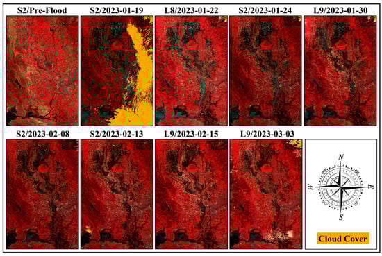 In the current research, images with cloud cover below 20% were employed for time-series flood identification. Subsequently, cloud-contaminated areas were masked using cloud removal bands from the images. The image collection corresponded to specific dates for flood identification, as illustrated in Figure 4.