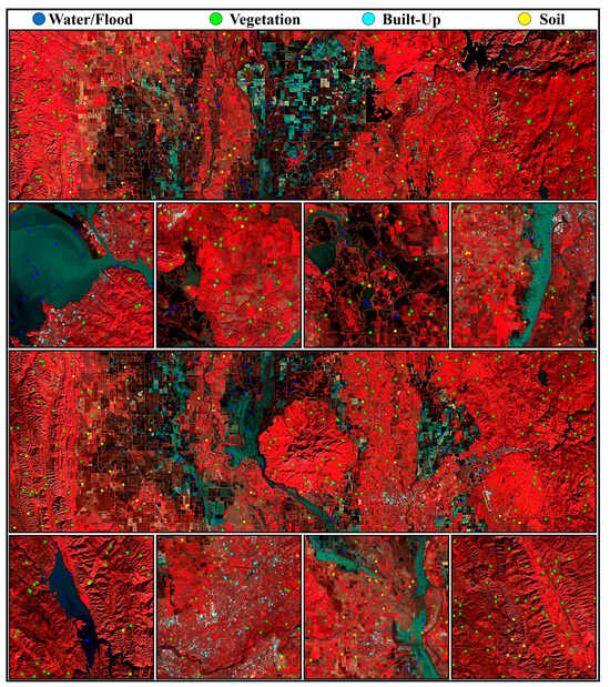 Examples of randomly selected training samples from the flood/water, vegetation, built-up, and soil classes were created using a fixed seed (10) for reproducibility.
