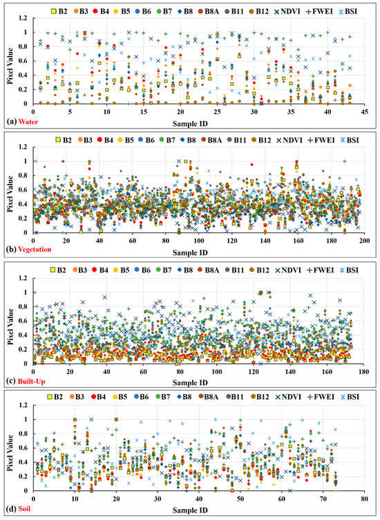 In Figure 8, the spectral behavior of automatically extracted training samples across different bands and spectral indices is depicted, offering insights into the variability and distribution of pixel values for four land cover types: (a) water, (b) vegetation, (c) built-up areas, and (d) soil. Each plot represents a range of spectral bands (B2, B3, B4, B5, B6, B7, B8, B11, and B12) and commonly used spectral indices (NDVI, FWEI, and BSI), plotted against the sample ID.