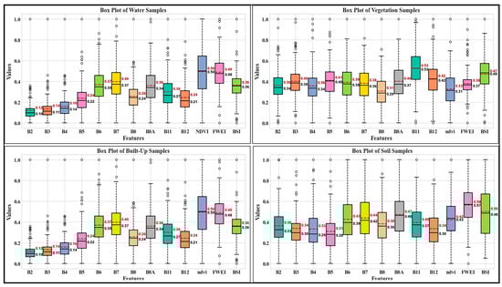 The box plots in Figure 9 illustrate the spectral characteristics of four land cover classes—water, vegetation, built-up areas, and soil—across various Sentinel-2 bands and indices (B2, B3, B4, B5, B6, B7, B8, B11, B12, NDVI, FWEI, and BSI). Each plot reveals distinct reflectance patterns for the different classes. Water samples show lower reflectance in the visible and infrared bands, particularly in B8 and B11, while vegetation exhibits higher values in the NIR region, which is characteristic of healthy vegetation. Built-up areas display greater variability across all bands, particularly in B11 and B12, reflecting the heterogeneity of urban materials. Soil samples have relatively balanced reflectance across bands, with notable variability in the SWIR region (B11, B12). Figure 7, Figure 8 and Figure 9 illustrate that the training samples extracted using the proposed method exhibit an optimal distribution across the spectral ranges of the bands and indices, contributing to higher accuracy in model training. Furthermore, the box plot in Figure 9 demonstrates the effectiveness of using spectral indices in the machine learning process. Consequently, the automatically generated training samples are highly valid for land cover classification, particularly for water bodies.