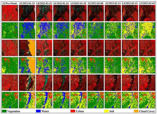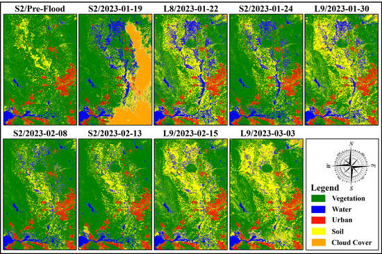 The results of the proposed method using RF classification, based on multi-sensor and multi-temporal imagery across four different classes, are presented in Figure 10. As shown, four maps correspond to Sentinel-2 images, one to Landsat-8, and three to Landsat-9, covering the flood period in the study area. It is important to note that the cloud cover class was derived using cloud cover bands and added to the classification maps for improved visualization. As illustrated in Figure 10, despite the extensive cloud cover in the western part of the study area in the Sentinel-2 image from 19 January 2023, which leaves no data for certain classes, the proposed method, utilizing multi-sensor images with a 3-day temporal gap, successfully identified water bodies in that region. Visually, the method effectively delineated four classes: water/flood, vegetation, built-up areas, and soil.